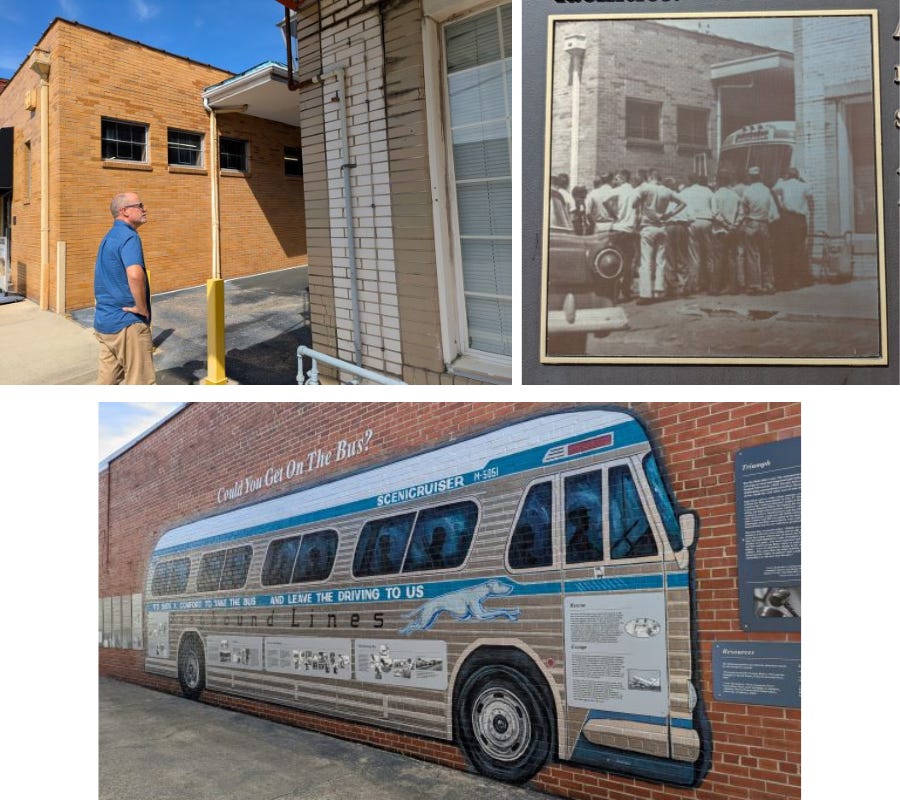 Roughly along our own travel route, we detoured to Anniston, Alabama, to see what we could find. The Greyhound station, the site of the very first Freedom Ride attack, has now been preserved as a National Historic Site. We stood in the loading and unloading alley next to the station where a Mother’s Day mob of angry men, some still in their church attire, surrounded the bus, rocked it back and forth, smashed the windows, and slashed the tires.
