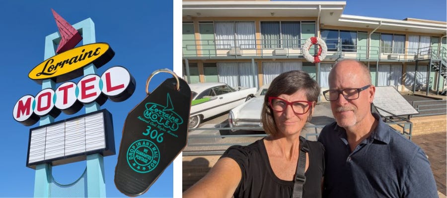 Having still done no research, we parked the truck on a side street and followed the other tourists and school groups toward the museum. When we came around to the front, our feet stopped, frozen in place. We stared up into the face of the Lorraine Motel, a scene immediately recognizable from historical photos we’d seen—Martin Luther King, Jr. was assassinated there on the balcony of Room 306. The motel, now restored to its April 4, 1968, 6:01 PM condition—complete with the cars that were parked there at that moment—felt like a movie set.