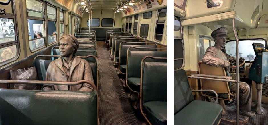 Over the next several hours, we dutifully read, studied, listened, looked. The museum was skillfully crafted. Life-size displays allowed us to stand in the crowd at a 19th century slave auction and a 20th century lunch counter sit-in. We stepped aboard the bus where Rosa Parks sat and, with her, faced the scorn of the bus driver, who was turned around in his seat. We examined the burned wreckage of another bus, a Greyhound carrying Freedom Riders who dared to sit interracially wherever they wanted. We walked up the Edmund Pettus Bridge among the marchers on what would be remembered as Bloody Sunday.
